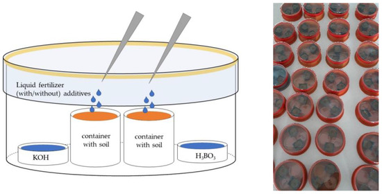 Two plastic containers with soil were placed into the hermetic chamber together with a petri dish containing 5 mL 4% boric acid (B0394/CAS: 10043-35-3; Sigma Aldrich, St. Louis, MO, USA) served as a sorbent for ammonia and a petri dish containing 4 mL 5% KOH (306568/CAS: 1310-58-3; Sigma Aldrich, St. Louis, MO, USA) for capturing CO2. The examined fertilizers solely or in combination with NHAs and UIs were then applied by micropipette on the soil surface of each container. Both types of NHA (acidic and neutral), lab-prepared NBPT solution and commercial StabilureN 30 were mixed into the fertilizers 10 min before their application at the ratios shown in Table 4. The dosage of NBPT in lab-made UI (NBPT) and commercial UI (StabilureN) applied to the liquid fertilizers were identical. The chambers were sealed by a petri dish with Ramsay’s grease immediately after the application of fertilizers (Figure 5). The hermetic chamber was left for 120 h (5 days) in the growth box (PlantMaster, CLF Plant Climatics GmbH, Wertingen, Germany) under precisely controlled temperature and light conditions (21 °C, 24 h night). The experiment ended after 5 days, as the content of the boric acid in the petri dish was quantitatively transferred using distilled water to a titration flask. Subsequently, its content was titrated with 0.02 M H2SO4 (339741/CAS: 7664-93-9; Sigma Aldrich, St. Louis, MO, USA) until the equivalence point was reached and the colour changed on the Tashiro indicator (0.75 g/L methyl red sodium salt + 0.375 g/L methylene blue in ethanol 50% (v/v), denatured).