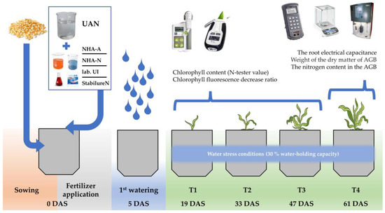 The fertilizers were applied to the soil surface immediately after the sowing; the examined treatments are described in Table 6. The dose of applied nitrogen was 0.4 g N/pot (1.33 mL UAN per pot), and it was identical for each treatment. Each treatment was established in four repetitions, and the vegetation pots were arranged randomly in the growth box.