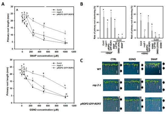 (A) Primary root length (mm) of Col-0, rop2-1; and pROP2:GFP:ROP2 complemented rop2-1 (labelled as pROP2:GFP:ROP2) Arabidopsis lines treated with 0, 50, 100, 250, 500, or 1000 µM SNAP or GSNO for 72 h. (B) Percentage values of primary-root shortening induced by 250 µM SNAP or GSNO in the investigated lines of Arabidopsis. Appropriately diluted DMSO, light-inactivated NO donors (iSNAP and iGSNO), and 250 µM SNAP/GSNO plus 800 µM cPTIO served as control treatments. (C) Images of seedlings of the same Arabidopsis lines treated with 250 µM SNAP or GSNO for 72 h. Arrows indicate the approximate length of the roots. CTRL is the control treated only with the solvent (DMSO in 250-fold and 40-fold dilutions for GSNO and SNAP, respectively). Bar = 10 mm. Data in (A,B) are averages and standard errors from three independent experiments with at least 10 roots each. Multiple comparison analyses were performed with SigmaStat 12 software using analysis of variance and Duncan’s test. Different letters sign significant difference at the p < 0.05 level.