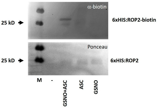 In vitro S-nitrosation of GSNO-treated 6xHIS:ROP2 protein as analyzed by Western blotting using an anti-biotin antibody (α-biotin) following the “biotin switch” method (upper picture). The absence of ascorbate (Asc) served as negative control. Ponceau S staining is shown as loading control (lower picture). M—molecular mass standard.