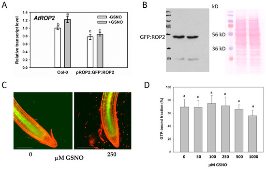 It was investigated whether GSNO treatment could alter the expression/abundance of ROP2 in the root. Although the transcript level of the endogenous ROP2 gene slightly, but significantly increased upon GSNO application, neither the transcript level nor the amount/fluorescence of the GFP:ROP2 protein controlled by the ROP2 promoter in the rop2-1 background changed in response to the treatment (Figure 3A–C).