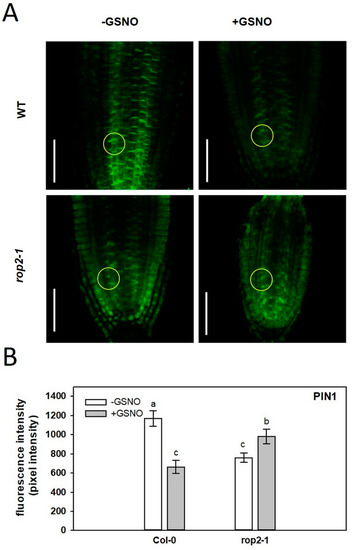 It has been reported that GSNO decreases the auxin maximum in the PR apex [16]. To investigate whether GSNO affects auxin transport in a ROP2-dependent way, localization of the PIN1 protein was examined via immunofluorescence in the apex of wild-type and rop2-1 roots exposed to GSNO (Figure 5). In the PR meristem of Col-0, GSNO decreased PIN1 protein abundance, while in the rop2-1 mutant, PIN1 level (stability) was increased in response to GSNO. It was also noted that PIN1 protein abundance was lower in the stele, but higher in the cortex of the ROP2-deficient root apices than in that of the wild-type. These observations indicate that GSNO disturbed the regulation of PIN1 abundance in the Arabidopsis root meristem dependent on the presence of ROP2.