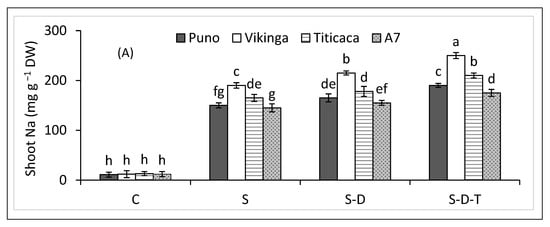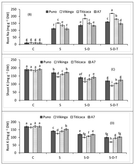 - Ruiz-Carrasco, K.; Antognoni, F.; Coulibaly, A.K.; Lizardi, S.; Covarrubias, A.; Martínez, E.A.; Molina-Montenegro, M.A.; Biondi, S.; Zurita-Silva, A. Variation in salinity tolerance of four lowland genotypes of quinoa (Chenopodium quinoa Willd.) as assessed by growth, physiological traits, and sodium transporter gene expression. Plant Physiol. Biochem. 2011, 49, 1333–1341. [Google Scholar] [CrossRef]