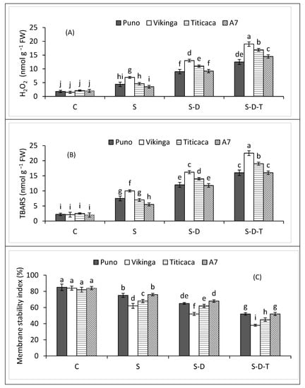 - Iqbal, H.; Yaning, C.; Waqas, M.; Shareef, M.; Raza, S.T. Differential response of quinoa genotypes to drought and foliage-applied H2O2 in relation to oxidative damage, osmotic adjustment and antioxidant capacity. Ecotoxicol. Environ. Saf. 2018, 164, 344–354. [Google Scholar] [CrossRef]
