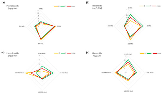| MEL Concentration | Type of Leaves | Phenolic Acids | Flavonoids | ||||||||