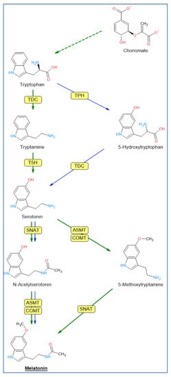Tryptophan, an amino acid that is synthesized from chorismic acid in plants, is the origin of the melatonin biosynthesis pathway [4,72,73] in animal and plant cells, but differs in some steps. In animal cells, tryptophan is converted to 5-hydroxytryptophan by tryptophan hydroxylase (TPH), an enzyme that apparently has not been identified in plants [74,75].