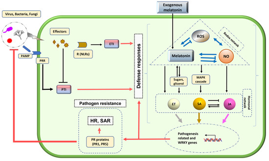 Model proposed for the interaction between plant pathogens (fungi, bacteria and virus) and defense responses mediated by melatonin. When a pathogen attacks plants, a defense system is activated: the pathogen-associated molecular patterns (PAMPs) of pathogens are recognized by the plant sensors called Pattern Recognition Receptors (PRRs) that trigger PTI (PAMP triggered immunity). On the other hand, effectors secreted by pathogens to facilitate infection (block PTI) are recognized by protein receptors (R) that contain nucleotide-binding domains and leucine-rich repeats (NLRs), triggering ETI (Effector-triggered immunity). This recognition activates a cascade of defense responses within the plant cell in which melatonin participates through the production and control of reactive oxygen species (ROS) and reactive nitrogen species (RNS), mainly nitric oxide (NO). At the same time both activate the melatonin endogenous biosynthesis, MAPK kinases cascade, sugars (cell wall reinforcement), defense hormones as ethylene (ET), salicylic acid (SA), jasmonic acid (JA), among others. All this activates the expression of WRKY and defense-related genes as plant resistance genes (PR1, PR5, and others), and consequently systemic acquired resistance (SAR) and the hypersensitive response (HR) are triggered. In this response process, treatment with exogenous melatonin plays an important role, helping to reinforce the plant’s defense, since it acts by increasing the endogenous level of melatonin in the plant cell. As a result, plants reinforced the melatonin-mediated protection against pathogens.