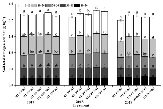 The total nitrogen content (TN) decreased with soil depth under all tillage treatments during 2017–2019 (Figure 1). The tillage affects the TN in the 0–40 cm soil layer in 2017 and the effect decreased within 0–30 cm in 2018 and 2019. TN content was no different in 0–10 cm and 40–50 cm in 2017 among the treatments, while it was significantly higher under the treatments with deep tillage combination in 20–40 cm than that under RT-RT-RT. During 2018 and 2019, the deep tillage increased TN content in 0–30 cm soil layer compared with RT-RT-RT, with the higher one under DT-SRT-SRT and DT-SRT-RT as 1.14 g kg−1 and 1.13 g kg−1, respectively, in 2018.