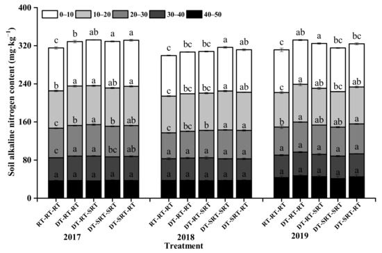 Similar to TN, the alkaline nitrogen content (AN) under all treatments was decreased with the increase in soil depth during 2017–2019 (Figure 2). Compared with RT-RT-RT, the AN was affected by treatments with deep tillage in 0–40 cm in the first year (2017), and the effect decreased within 0–30 cm during the following two years. During the three-year experiment, the AN content was increased under the treatments with deep tillage compared with that under RT-RT-RT. While among the treatments with deep tillage, AN content did not demonstrate a significantly different or clear trend. It indicated that the effect of deep tillage was bigger than the combined other two tillage modes.