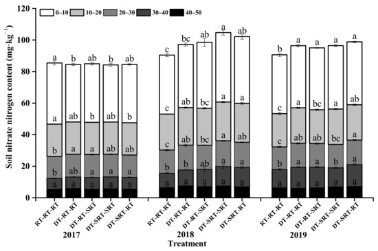 The soil dissolved organic nitrogen content (DON) under all treatments decreased first and then slightly increased with time. The major change happened in the 10–30 cm soil layer (Figure 5). The DOC content did not differ from all treatments in 0–10 cm in 2017, but it decreased under RT-RT-RT in the following two years. The DOC was no different in the 40–50 cm soil layer in 2017 and 2018, while it was in the 30–50 cm soil layer in 2019. It indicated that the effect of deep tillage decreased in the third year. Although the DON, generally, was no different among the treatments with deep tillage, the DON under DT-SRT-SRT and DT-SRT-RT was significantly higher than that under RT-RT-RT in 0–30 cm in 2018 and 2019, with the highest value of 23.37 and 25.49 mg kg−1 under DT-SRT-SRT in the 0–10 cm soil layer.
