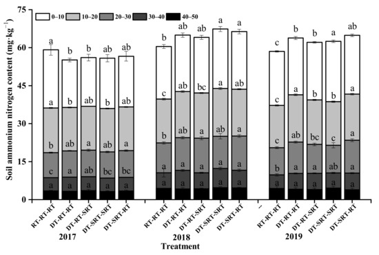 The ammonium nitrogen (NH4+-N) content under all treatments decreased with the increasing soil depths, and it slightly increased with time. The effect of tillage on NH4+-N in 0–40 cm during 2017–2019 (Figure 4). Similar to NO3−-N, the NH4+-N content in 0–20 cm soil layer under RT-RT-RT did not differ from that under the treatments with deep tillage, while it was lower under RT-RT-RT in 0–40 cm during the following two years. Meanwhile, the NH4+-N content in 0–30 cm soil layer under treatment with deep tillage significantly increased with time, the NH4+-N content under DT-SRT-SRT treatments was significantly higher than that under RT-RT-RT treatments, the highest increase was 35.12% in 2018. In 2019, the NH4+-N content in the 0–40 cm soil layer was significantly higher under DT-SRT-SRT than that under RT-RT-RT with the highest value of 23.82 mg kg−1 in the 0–10 cm soil layer.