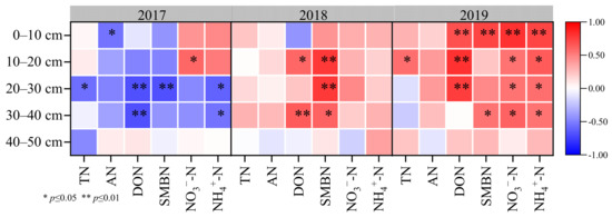 The correlation analysis found that the different nitrogen form in different soil layers was negative in the first year of the three-year rotation, while the correlation increased with time (Figure 7). In 2019, except TN and AN, the other nitrogen forms content was all significantly positively correlated with wheat yield in the 0–10 cm soil layer. Additionally, the NO3−-N and NH4+-N were positively correlated with wheat yield in the 0–40 cm soil layer.