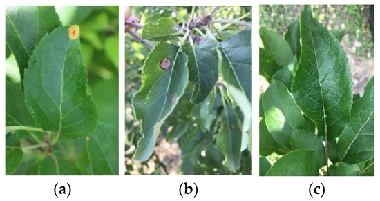 Example of apple leaf images: (a) rust; (b) ring rot; (c) healthy.
