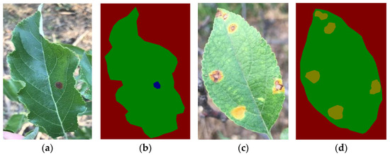 Several studies have recently been conducted in recognizing apple leaf disease images and achieved good results [16,17,18]. However, few studies have been carried out on the segmentation of apple leaf lesion areas and diagnosis of disease severity based on the idea of semantic segmentation. Chao et al. [19] proposed the use of the full convolution semantic segmentation network model based on an encoder and decoder to recognize four common diseases of apple leaves. In addition, the end-to-end pixel classification of the apple leaves’ diseased spot area, healthy leaf area, and background area were realized, but the disadvantages were that the study objects did not include cases of multiple diseases in a single leaf image, and the severity of the disease was not diagnosed.