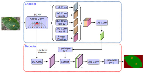 - Chen, L.C.; Zhu, Y.; Papandreou, G.; Schroff, F.; Adam, H. Encoder-decoder with atrous separable convolution for semantic image segmentation. In Proceedings of the European Conference on Computer Vision (ECCV), Munich, Germany, 8–14 September 2018; pp. 801–818. [Google Scholar]