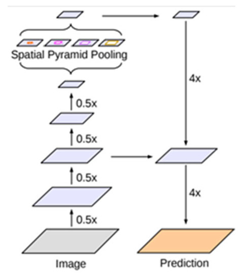- Zhao, H.; Shi, J.; Qi, X.; Wang, X.; Jia, J. Pyramid scene parsing network. In Proceedings of the IEEE Conference on Computer Vision and Pattern Recognition, Honolulu, HI, USA, 21–26 July 2017; pp. 2881–2890. [Google Scholar]
