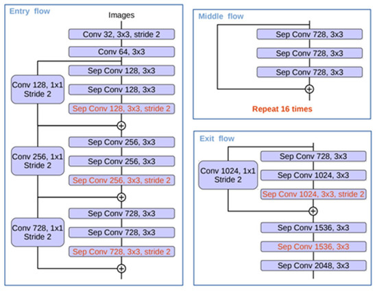 Moreover, an improved Xception is used as the backbone of the DeepLabV3+ network to improve segmentation speed and accuracy of the network. The improved Xception network is shown in Figure 5. Improvements to Xception mainly include the following aspects: (1) Entry flow remains the same, but more middle flow is added. (2) All max pooling layers are replaced by depthwise separable convolutions with stride = 2. (3) Batch normalization and ReLU operations are added after each 3 × 3 depthwise convolution.