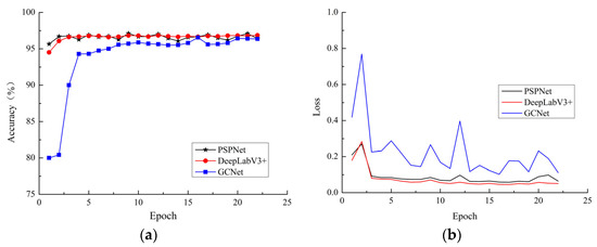 To compare and analyze the convergence performance of three semantic segmentation network models (DeepLabV3+, PSPNet, and GCNet) on the verification set, the curve of pixel accuracy and loss value of the three semantic segmentation network models on the validation set with the change of training times is shown in Figure 8.