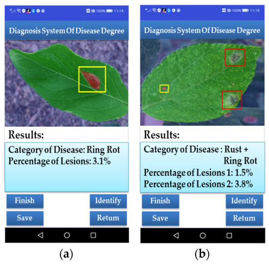 The results of APP program recognition: (a) the result of a single disease per leaf; (b) the result of multiple diseases per leaf.