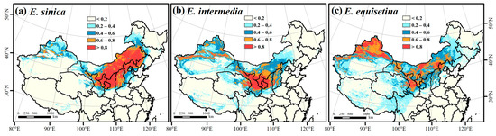 Prediction of the spatial distribution of E. sinica (a), E. intermedia (b), and E. equisetina (c) in China based on the ensemble model.
