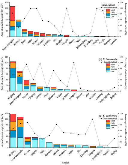 We also carried out statistics and analysis on the area of three kinds of Ephedra herbs in different administrative regions with different levels of suitability (Figure 3). As shown in Figure 3a, Inner Mongolia had the largest total suitable area for E. sinica, with approximately 106.53 × 104 km2, followed by Xinjiang and Gansu, with 59.16 × 104 km2 and 26.81 × 104 km2, respectively. Although the total area of suitable areas in Xinjiang was relatively high, most of these sites had low suitability and were not recommended for the growth of E. sinica. According to the percentage of suitable areas (more than 80%) and the area of the ISH, Inner Mongolia, Gansu, Hebei, Shanxi, Shaanxi, and Ningxia were most suitable for the development of E. sinica. In Figure 3b, the total suitable area for E. intermedia was the highest in Xinjiang, with approximately 104.16 × 104 km2, followed by Inner Mongolia and Gansu, with values of 70.70 × 104 km2 and 38.72 × 104 km2, respectively. The percentage of suitable regions and ISH areas were evaluated, and Xinjiang, Gansu, Inner Mongolia, Shaanxi, and Ningxia were most suitable for planting E. intermedia. In Figure 3c, the total suitable area for E. equisetina was the highest in Xinjiang (118.25 × 104 km2), followed by Inner Mongolia (108.03 × 104 km2). The total suitable area was high in Qinghai, Tibet, and Sichuan, but the proportion of areas with low suitability was high, making it unsuitable for the growth and survival of E. intermedia. However, Xinjiang, Inner Mongolia, Gansu, and Ningxia had large ISH areas for E. equisetina, accounting for a relatively high proportion.