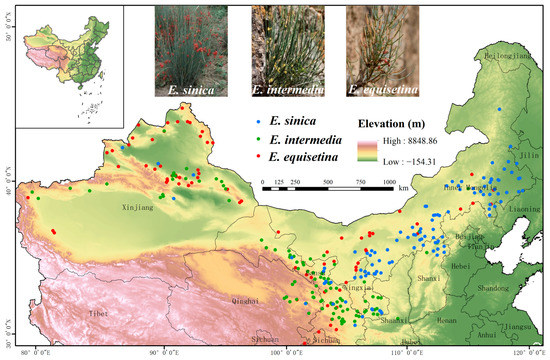 Ephedra species are perennial herbs of the Ephedra genus in Ephedraceae. Members of this genus are commonly found in dry wastelands, riverbeds, and grasslands. They are important species associated with sandy grassland and frequently form a large area of a simple community [1]. These plants are important sand fixation plants in Northwest China and assist with water and soil conservation, desertification prevention, and environmental improvement because of their high drought tolerance and ability to withstand extreme temperature and saline alkali [2]. Fifteen Ephedra species and four varieties can be found in China, and E. sinica, E. intermedia, and E. equisetina are the main varieties used in medicine [3]. Three Ephedra herbs have been widely used as traditional Chinese medicine (TCM) since ancient times [4] and are used to primarily treat colds, coughs, and asthma [5]. The medicinal effect of Ephedra cannot be achieved without active substances. Ephedra herbs contain a variety of alkaloids, volatile substances, flavonoids, sugars, minerals, among which the content of alkaloids is the highest, and alkaloids are the main active components of Ephedra [6]. Modern pharmacological studies have revealed that Ephedrine has the functions of favoring sweating, alleviating colds, promoting lung health, relieving asthma, and detumescence. Many effects of Ephedra are associated with ephedrine-type alkaloids. The effects of various secondary metabolites differ. For example, ephedrine is an effective component for ephedra to play analgesic, regulate blood pressure, stimulate the central nervous system, and relax bronchial smooth muscle [7,8,9,10]. Pseudoephedrine is an effective component for ephedra to play diuretic and anti-inflammatory [11,12]. However, the alkaloid contents showed certain differences among the three species, so we need to predict the suitable habitat of the three ephedra species respectively. In addition, as an important forage grass, Ephedra herbs have edible and medicinal properties, can effectively prevent livestock diseases, and promote the development of local animal husbandry [13]. Clearly, Ephedra herbs have tremendous ecological, medicinal, and economic value. However, there has been a rapid increase in the demand for Ephedra herbs on the international market in recent years, and their price and economic benefits have also increased, resulting in an increase in destructive harvesting. The scope of Ephedra species distribution has been greatly reduced, resulting in significant grassland degradation as well as water and soil erosion. Grassland and desert ecosystems have been harmed, affecting the normal production and way of life of farmers and herders [14]. Research on the suitable habitat of Ephedra herbs contributes to the conservation of their resources and the restoration of their ecosystems [15,16]. As a result, it is necessary to investigate the potential distribution and explore the ecological suitability of Ephedra herbs. Because the alkaloid contents of these three Ephedra herbs differ, so do their medicinal value. It is necessary to predict the potential distributions of E. sinica, E. intermedia, and E. equisetina.