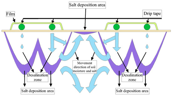 Generally, different from the irrigation strategy triggered by crop evapotranspiration (ETc) [2,7], the soil moisture lower limit is also used as the indicator for triggering irrigation [8,9] since the available soil water in the root zone is in the range of field capacity to wilting coefficient [10,11,12]. According to the principle of “soil salt moves with water”, soil salinity is easily influenced by irrigation regimes, while soil salt distribution follows the soil water flux pattern [13]. According to the point-source infiltration characteristic of drip irrigation, soil salt, along with infiltration water, tends to move toward the fringes of the irrigated area, which then builds a desalinization zone close to the emitters (Figure 1) [14]. Zhang et al. [13] indicated that soil salt mainly accumulated in the surface soil between the adjacent films after crops were harvested, and the amount of soil salt accumulation was 1.24–2.34 times more than that at the depth of 50 cm below the drip tape. Moreover, the soil salt tended to accumulate at the edge of the wetted bulb, and the amount of soil salt accumulation in the surface layer was much greater than that in the deeper layers. Though excessive irrigation can leach the soil salt to a certain extent, heavy irrigation is not conducive to saving water. Thus, it is necessary to investigate the proper irrigation amount for the effective regulation of soil salt. Wang et al. [15] found that drip irrigation with lower soil water lower limits exhibited significant positive impacts on soil salt regulation, while Li et al. [6] revealed that more soil salt moved outside the film with higher soil water lower limits under mulched drip irrigation. Moreover, the increase in irrigation frequency and decrease in irrigation amount for each application were conducive to preventing the upward rise of underground water [16]. It is obvious that the greater the irrigation amount, the deeper the leaching salt depth and the better the leaching effect [7,17,18]; however, the inconsistent irrigation amount and irrigation times regulated by soil moisture increase the difficulty in exploring the distribution of soil water and soil salt.