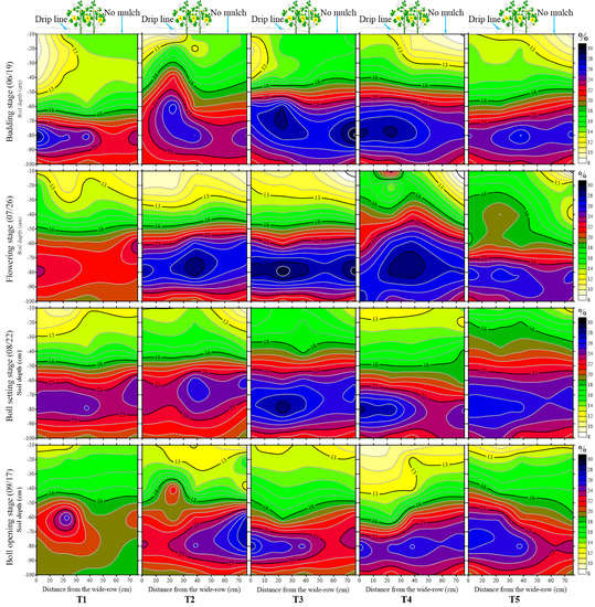At the flowering stage, the irrigation times for treatments were inconsistent due to the differently designed levels of soil moisture lower limits. On 19 July, drip irrigation with the amounts of 32 and 45 mm was applied for the T2 and T3 treatments, respectively, while on 23 July, irrigation water with the amounts of 19, 58, and 70 mm was applied for the T1, T4, and T5 treatments, respectively. According to the soil samples collected on 26 July, the average soil moisture at the flowering stage increased by 8.22%, 2.82%, −5.68%, 13.87%, and 11.81%, respectively, compared with that at the budding stage. Moreover, the lower the soil moisture lower limit, the larger the humid region. Obviously, the soil moisture in the 0–60 cm layer at the cotton flowering stage for the T4 and T5 treatments was significantly higher than that for the T1, T2, and T3 treatments. Though soil water content in the 0–40 cm layer for the T1 treatment was significantly higher than that for the T2 and T3 treatments, soil moisture in the 60–100 cm layer was significantly lower than that for the T2 and T3 treatments.