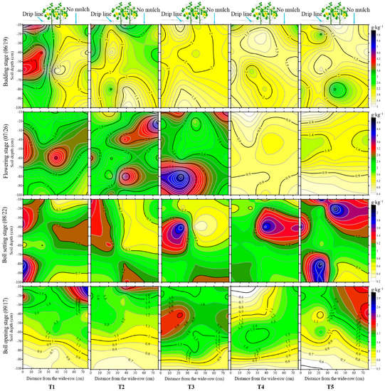 The soil salinity at the boll opening stage for the treatments was in the range of 0.6–2.0 g·kg−1. In the vertical direction, soil salinity for the T1 and T2 treatments, both inside and outside the film, gradually decreased with the increase in soil depth, and soil salt accumulated in the topsoil, especially in the 0–20 cm layer in inter-film zone. Soil salts in the top layer were leached to the 0–60 cm layer outside the film and the layer of 30–60, 60–80, and 40–70 cm inside the film for the T3, T4, and T5 treatments, respectively. Meanwhile, the soil salt in the 80–100 cm layer for treatments decreased with the increase in soil depth. In general, soil salinity in the horizontal direction for treatments reached the minimum value under the drip line, followed by the narrow row zone and the wide row zone, and had the maximum value in the inter-film zone. In the vertical direction, after drip irrigation, soil salinity inside the membrane first increased and then decreased with the increase in soil depth, with an oval shape formed under the drip tape.