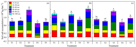 Soil salt accumulation at the end of the cotton’s growth period. (a) Soil salt accumulation inside the film; (b) soil salt accumulation outside the film; (c) the total soil salt accumulation. Bars are the one standard error of the mean (n = 3). Different letters above the error bars indicate a significant difference at p < 0.05 according to the Duncan test.