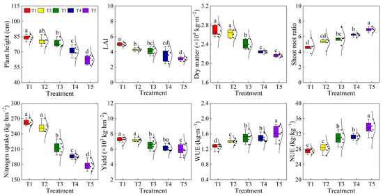 Plant height, LAI, dry matter, shoot–root ratio, nitrogen uptake, yield, WUE, and NUE of cotton at the boll opening stage. Different letters above the boxes indicate a significant difference at p < 0.05, according to the Duncan test.