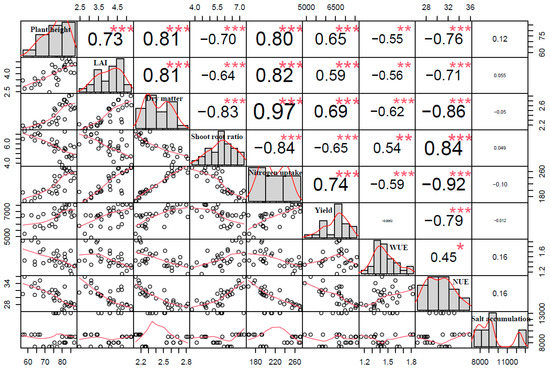 Multi-panel scatter plots of tested indexes, including the plant height, LAI, dry matter, root–shoot ratio, nitrogen uptake, yield, WUE, NUE, and salt accumulation of cotton. Phenotypic traits with their histograms are given in the diagonal panel. Lower panels represent pairwise scatter plots, with red lines depicting the best fit, and the upper right panels show Pearson correlation coefficients. Symbols “***”, “**”, and “*” indicate the significance levels of p < 0.001, 0.01, and 0.05, respectively.