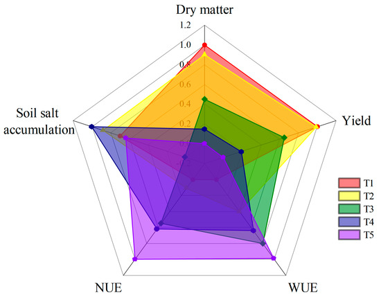 Comparison of dry matter, yield, WUE, NUE, and soil salt accumulation after the value normalized.