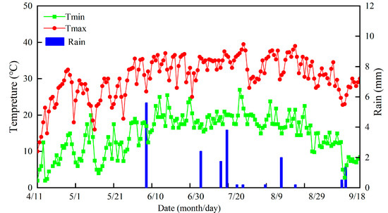 The meteorological data, including daily temperature, rainfall, and wind speed, were obtained from an automatic weather station (YM-03A) that was 50 m away from the experimental field area (Figure 10). Daily water surface evaporation was measured every day at 18:00 with an evaporation pan. The groundwater buried depth in the field during the cotton growth period was observed by an automatic record water level meter.