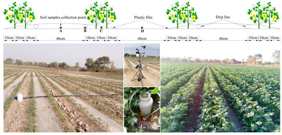 Soil samples for moisture determination were collected at position B in Figure 10 every day, with an auger (5 cm in diameter and 25 cm in height) during the growth period of cotton at a depth of 0–20, 20–40, and 40–60 cm, respectively. Additional soil samples for soil water and soil salinity measurement were taken at positions A (wide row zone, abbreviated as WRZ), B (drip line, abbreviated as DI), C (narrow row zone, abbreviated as NRZ), and D (inter-film zone, abbreviated as IFZ) at the soil depth of 0–10, 10–20, 20–40, 40–60, 60–80, and 80–100 cm at the end of each cotton growth stage (budding, flowering, boll setting, and boll opening stages).
