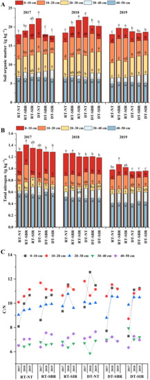 The C:N ratio, SOM, and TN decreased with soil depth, and the first was higher than the others at 0–20 cm (Figure 1C). Compared with the treatments with rotary tillage, the C:N ratio at 20–40 cm soil depth increased under treatments with deep tillage in wheat season. Moreover, the C:N ratio under DT-SIR increased by an average of 7.11% during the three years compared to RT-SIR.