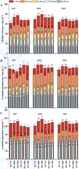 Soil alkaline nitrogen (A), available phosphorous (B), and available potassium (C) under different treatments from 2017 to 2019 during the experiment. Bars represent standard error. Different lowercase letters above the bars represent significant differences among treatments (p < 0.05).