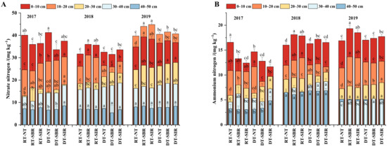 For the maize season tillage in 2017, compared with the treatments with subsoiling, the NO3−-N content at 0–10 cm and the NH4+-N content at 0–20 cm increased by an average of 13.65% and an average of 19.56%, respectively, under the treatments with no-till. However, the opposite trend was found in the 0–20 cm layer in 2018–2019, where the NO3−-N and NH4+-N contents under subsoiling were 7.35% and 7.39% higher, respectively than under no-till. At 20–40 cm, the NO3−-N and NH4+-N contents were higher under DT-SIR than under other treatments.