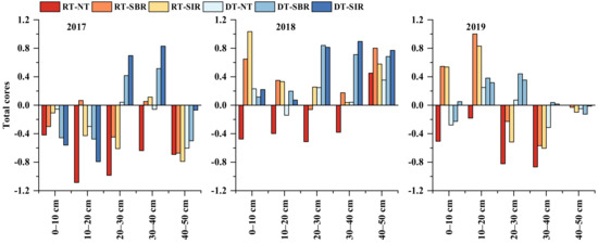 The PCA (Figure 4) showed 74.99–88.58% of the variability at 0–50 cm. The eigenvalues and the variance contribution rates for the different soil depths are reported in Table 2. The integrated score at 0–20 cm under RT-SBR and RT-SIR was higher than that under the other treatments, which indicated that the combination of rotary tillage in the wheat season and subsoiling in the maize season improved the soil nutrient content in the 0–20 cm soil layer. The integrated score under all treatments in the 0–10 cm soil layer was the highest in 2018. The positive and higher integrated scores in the 20–40 cm soil layer was under DT-SBR and DT-SIR and reached their peaks in 2018. Additionally, in the 40–50 cm layer, the integrated scores under all treatments were greatest and positive in 2018. Generally, the integrated scores under the treatments with rotary tillage in the wheat season and subsoiling in the maize season in the surface layer (0–20 cm), and the treatments with rotary tillage in the wheat season and subsoiling in the maize season in the subsurface layer (20–40 cm) showed positive values in 2018 and 2019.