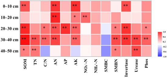 Although the soil EMF index was positively correlated with soil nutrient content, there were obviously differences among the depths (Figure 6). More soil nutrient indexes at 20–40 cm correlate with the EMF index than at 0–20 cm or 40–50 cm. In the 0–20 cm soil layer, the soil EMF index was significantly correlated with SOM, invertase activity, and available nutrients. In the 20–40 cm soil layer, the EMF index showed significant or highly significant correlations with SOM, TN, C:N, AN, AP, AK, SMBC, and three enzyme activities. In the 40–50 cm soil layer, the EMF index showed significant or highly significant correlations with SOM, TN, SMBN, and urease activity.