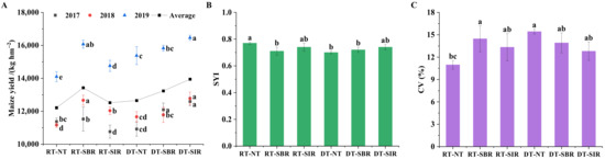 The maize yield (A), sustainability yield index (SYI, (B)), and coefficient of variation (CV, (C)) under different treatments. Different lowercase letters above the bars represent significant differences among treatments (p < 0.05).