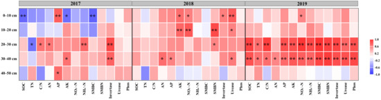 The ANOVA results (Table 1) show that soil depth, year, treatment, and their interactions all had significant or highly significant differences in SOC, TN, C/N, AP, AK, NO3−N, and NH4+-N, but not in AN.