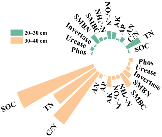 The contribution of soil nutrient factors to maize yield was higher at 30–40 cm than at 20–30 cm (Figure 9). Furthermore, SOC, C/N ratio, and TN were the key factors affecting maize yield in the 30–40 cm soil layer.