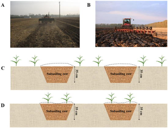 Studies have found that rotation tillage in the winter wheat season was an important practice that enriched the microbial community structure and increased the soil enzyme activity, thus facilitating the conversion and accumulation of soil nutrients and improving crop yields [2,5]. Deep tillage to 30 cm increased total soil N content in the 0–40 cm soil layer and improved crop root distribution [6], further promoting crop water efficiency and grain production [7]. Rotary and subsoiling tillage rotations combined with straw return could increase soil nutrient content and crop yield [8,9]. Liu et al. [10] reported that lower compaction and higher SOC were found under no-till combined with subsoiling (NS), which suggested that NS improved soil physicochemical properties. Subsoiling tillage was not only effective in the topsoil but also in the subsoil. This was confirmed by a study in China that found subsoiling to a depth of 35 cm increased the available soil nitrogen, phosphorus, and potassium contents in the 20–40 cm soil layer, contributing to an increase in annual yield [2,11]. Combined with the straw return, subsoiling tillage was effective in avoiding soil compaction and facilitating soil aggregation [12,13,14,15], while deep tillage could raise the soil fertility and increase the thickness of the cultivated horizon, further leading to higher SOC and TN [16,17,18]. However, these studies were focused on the wheat season and less on the maize season. For maize season, long-term no-till led to compaction in the subsoil, which seriously hindered the exchange of water, fertilizer, air, and heat and thus reduced soil quality and crop yield [19,20].