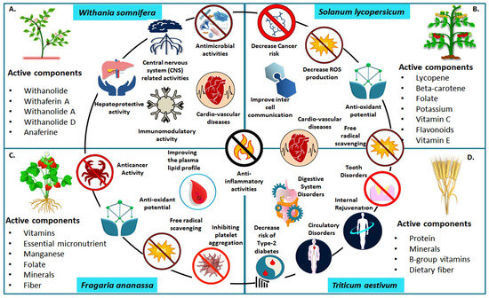 Overview of the nutritional value-addition and health benefits of selected crop plants viz; (A) Ashwagandha (Withania Somnifera) (B) Tomato (Solanum lycopersicum) (C) Strawberry (Fragaria ananassa) (D) Wheat (Triticum aestivum).