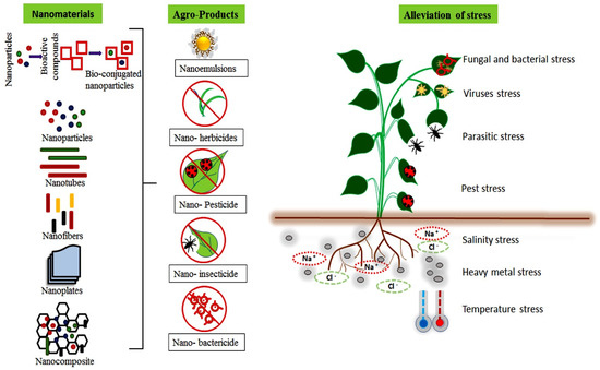 Global progress in agricultural crop production may be hampered because of the increased prevalence of environmental stresses [102]. Climatic stresses originate from rising temperatures, heat waves, drought, and the accumulation of heavy metals, while a variety of biotic stresses, such as fungal and bacterial diseases and insect infestation, put pressure on agriculture [103]. These stresses significantly affect crop yields and, for heavy metals, increase the accumulation of different toxic elements in plant tissues, rendering them unfit for consumption by animals and humans, with otherwise serious health problems [104]. Moreover, biotic and abiotic stresses negatively affect the growth and economic expansion of agricultural and horticultural crops [105]. Besides, climatic stress can cause pollen sterility, shriveled seeds, disrupted photosynthetic and respiratory enzyme activities, and an increase in the production of reactive oxygen species (ROS), with negative impacts on plants [106,107]. Notably, biogenic nanomaterials have recently been explored for use in counteracting the damaging effects of a variety of environmental stressors, including heavy metals, drought, salinity, high temperature, and bacterial and fungal pathogens [102]. Green synthesis of nanomaterials gained serious attention in recent years due to their sustainable application in the agricultural system [108]. Several biogenic metallic nanoparticles viz; AgNPs, AuNPs, CuNPs, FeNPs, FeS2NPs, TiO2NPs, ZnNPs, and ZnONPs, have been used to improve seed germination, plant growth, and stress tolerance in a variety of crop plants, as well as in the direct inhibition of plant pathogens, with a view to application in real plant pathosystems [109,110,111]. For instance, biosynthesized AgNPs enhanced plant growth and development by improving seed germination, growth parameters, water content, photosynthetic pigments, osmolytes, and antioxidant pigments [112]. Similarly, Noman et al. [113] reported biogenic CuNPs alleviated salt stress in maize by modulating cellular oxidative repair mechanisms. Del Buono et al. [44] also described biogenic ZnNPs synthesized from Lemna minor (duckweed) enhanced the physiochemical and biochemical traits in maize. An overview of nanomaterials-based agri-product and their role in the alleviation of biotic and abiotic stresses is provided in Figure 3.
