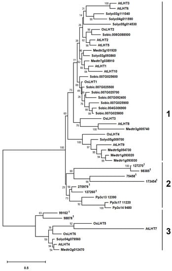 Phylogenetic relationship analysis of LHT proteins from Solanum lycopersicum, Arabidopsis thaliana, Physcomitrella patens, Oryza sativa, Selaginella moellendorffii, Medicago truncatula and Sorghum bicolor. Multiple-protein-sequence alignment was performed using Clustal X (1.83) software, and the tree was constructed according to the maximum-likelihood (ML) method with the p-distance substitution model using MEGA X software. We used 1000 replicates in the bootstrap analysis to determine the support value for each branch. The clusters are numbered. 1 Phytozome gene identifier of Selaginella moellendorffii.