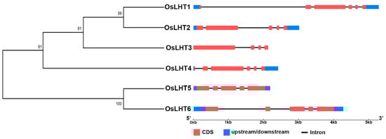 To investigate the structural diversity of the OsLHT genes, an unrooted phylogenetic tree was constructed by aligning the full-length sequences of the six OsLHT proteins. The members of the OsLHT family can be classified into two clusters containing four and two members, respectively (Figure 2). We compared the transcript and genomic sequences of each OsLHT gene to examine the intron/exon organization using the GSDS website (http://gsds.cbi.pku.edu.cn/) (accessed on 5 August 2022). The results showed that there are between three and five introns in the coding sequences of the six OsLHT genes. Members of the same subfamily have similar intron/exon structures. Of note, only the OsLHT3 gene is not upstream and downstream.