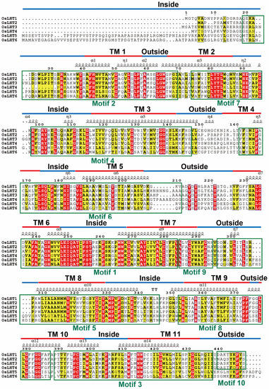 The multiple-sequence alignments for OsLHT proteins in rice. The secondary structures, conserved motifs and TM regions are marked by symbols, boxes and lines, respectively.