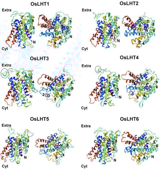 Previous studies have reported that the members of the LHT family can transport amino acids in Arabidopsis and rice [16,18]. To verify the transport function of LHT genes, the membrane-protein topology prediction tool DeepTMHMM was used to predict the putative TM regions; each OsLHT protein had 11 helical TMs. To further examine the relationship between the conserved motifs and the TM areas of OsLHT proteins, multiple-sequence alignment was performed and highlighted the secondary structures, conserved motifs and TM regions, as shown in Figure 3. The TM regions and conserved motifs were found to be highly correlated. Motifs 4 and 5 included the complete TM 3 and TM 8 regions, while the majority of the TM 2 and TM 7 areas were found in motifs 7 and 9. The tenth TM area was the location of motif 3, which continued into the subsequent sequences after the eleventh TM region. In addition, motif 1 contained the most regions of TM 6 and TM 7, while motifs 2, 6 and 8, respectively, contained the complete TMs 1, 5 and 9 and most regions of TMs 2, 4 and 10. The OsLHT proteins had a total of 14 α-helices and 7 η-helices, and only α2, α4, η2, η3, η4, η6 and η7 were found in the non-transmembrane regions, while the remaining secondary structures were found in the transmembrane areas to maintain the transport function of the LHT proteins (Figure 3). The structures of the OsLHT proteins were predicted using SwissModel servers (Figure 4). It became apparent that all predicted OsLHT proteins had 11 helical TMs and displayed complex 3D structures, including multiple secondary structures (Figure 4). In addition, in contrast to OsLHT1, 2, 5 and 6, OsLHT3 and OsLHT4 had a partial a-helix in the extracellular portion between the fifth transmembrane region and the sixth transmembrane region (Figure 4).